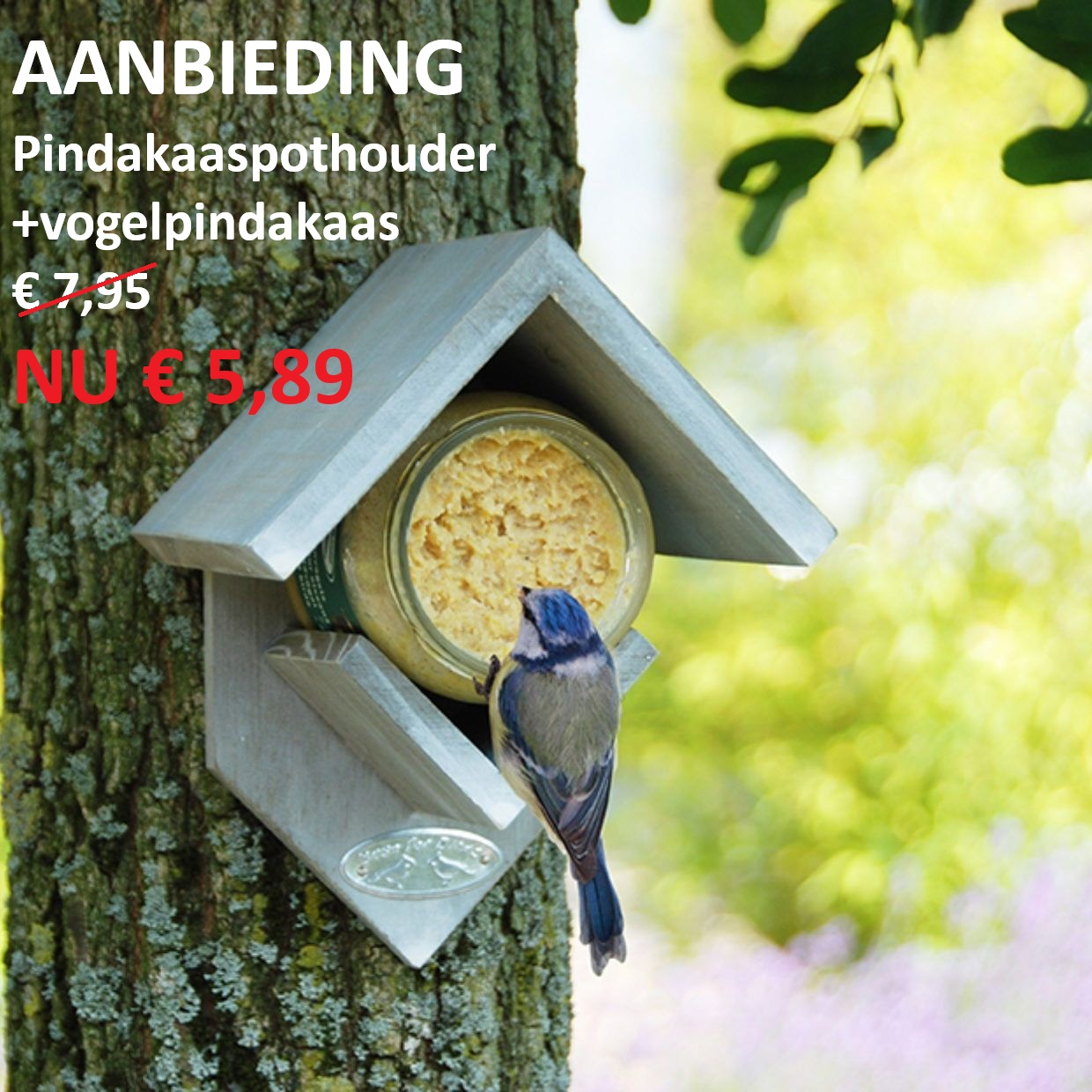 Gebruik een pindakaaspothouder, beschikbaar in hout, metaal of kunststof. Plaats die op een rustige, beschutte plek, minimaal 1,5 meter boven de grond, en uit de buurt van katten. Bekijk onderaan deze pagina onze aanbevolen houders.